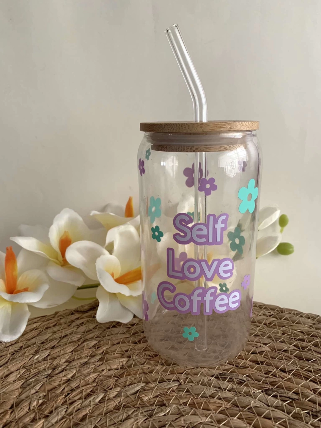 - Design : ” Self love coffee” met kleurrijke bloemen.